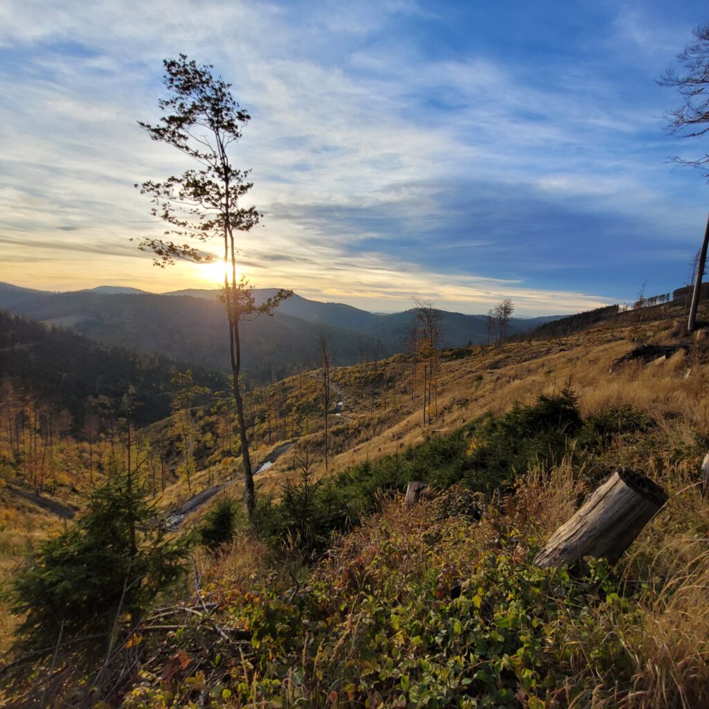 Szlakiem czerwonym docieramy do schroniska Przegibek. Chwila oddechu i udajemy się w kierunku szlaku zielonego, aby zjechać do Rycerki górnej. Wybór tego szlaku na zjazd, podczas złotej godziny okazuje się strzałem w 10!. Zachód słońca wśród krajobrazów widocznych na szlaku to po prostu coś pięknego!
