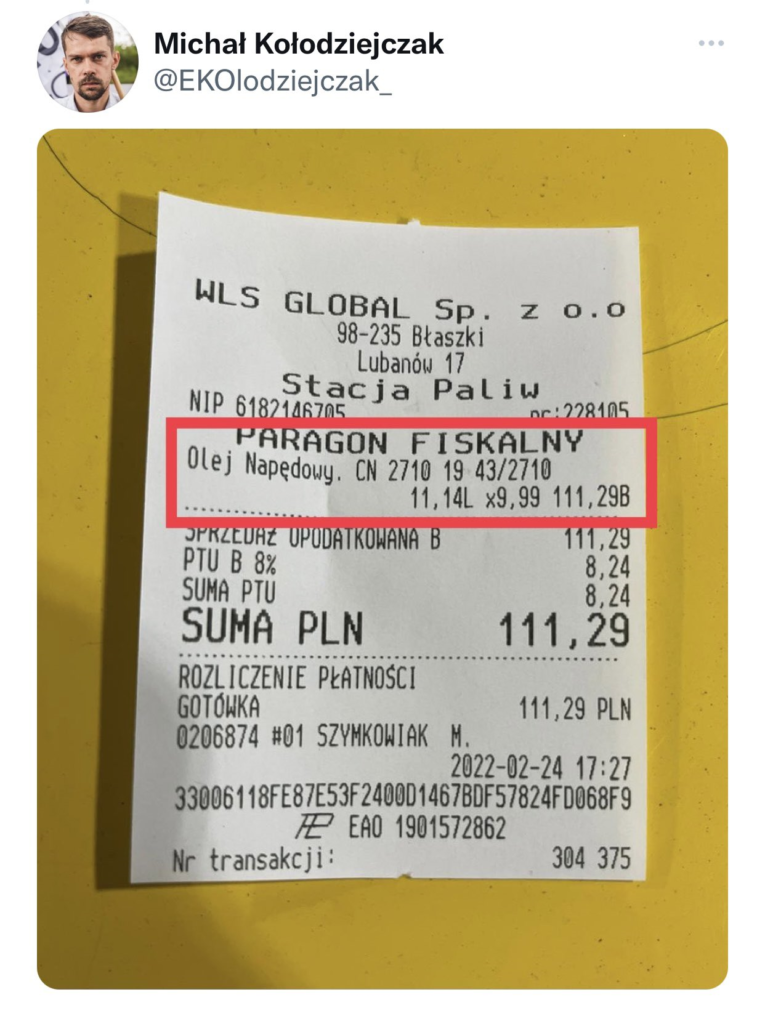 Na potrzeby przykładu, posłużę się zdjęciem z jednego z ostatnich wpisów na twitterze, do którego zostało dołączone zdjęcie paragonu ze stacji benzynowej sprzedającej paliwo za dość wysoką cenę: