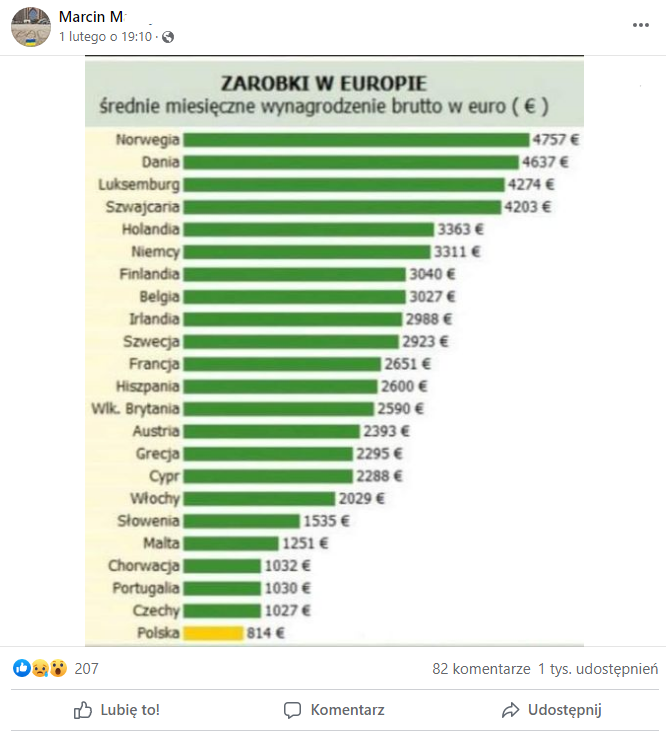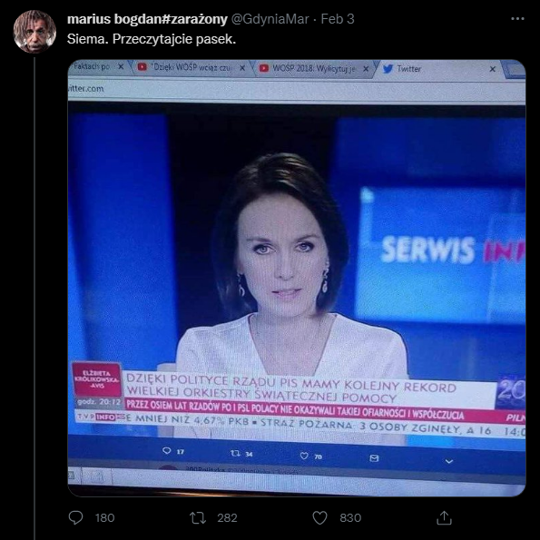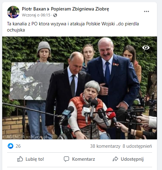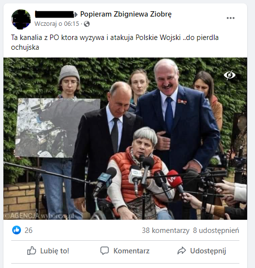Powyżej mamy przykład wpisu podpartego źródłem będącym portalem pseudoinformacyjnym (informacja o narko-testach), wiadomości ze zdjęciami wykorzystanymi w kontekstach innych niż pierwotne (zdjęcie Bałtyku, wykres zarobków w Europie) oraz wpisy ze zgrabnymi fotomontażami (klatka z materiału wideo serwisu informacyjnego oraz zdjęcie z Panią Janiną Ochojską).