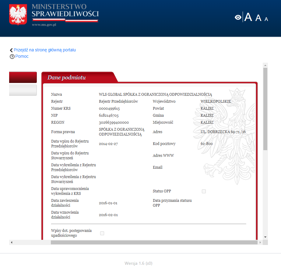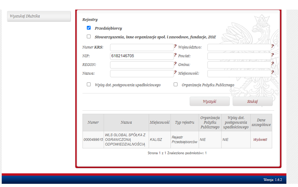 Jako, ze w nazwie firmy widnieje zapis, że to spółka, do walidacji danych skorzystamy z wyszukiwarki KRS (baza CEIDG nie zwróci rekordów dla podmiotu będącego spółką):