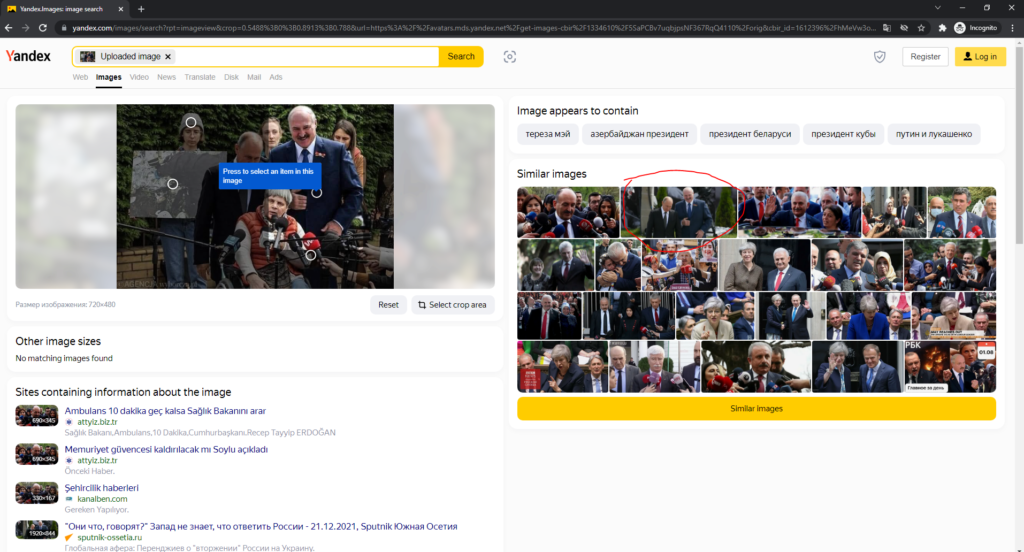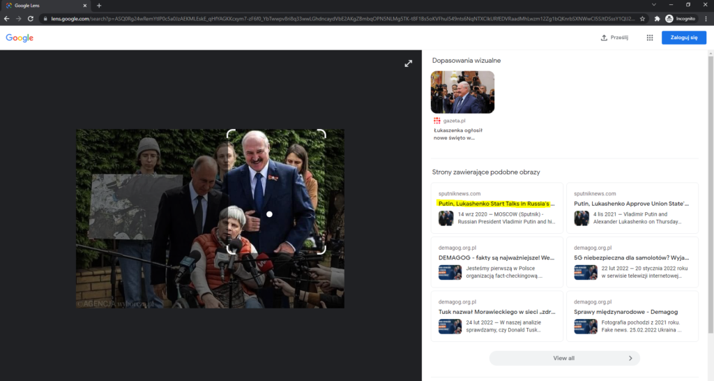 Z tego powodu warto zaznaczać obszar zdjęcia, po którym ma nazstąpić wyszukiwanie. Dla przykładu zaznaczyłem postać Aleksandra Łukaszenki. To spowodowało znalezienie takich oto wyników: